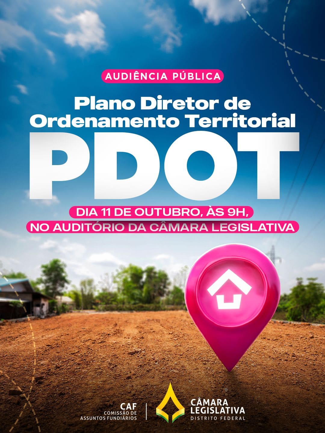 No próximo dia 11 de outubro, às 9h, será realizada, no auditório da Câmara Legislativa do Distrito Federal (CLDF), uma Audiência Pública sobre o Plano Diretor de Ordenamento Territorial (PDOT).
