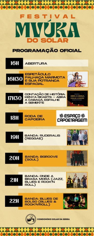 A primeira edição do Festival Mvúka do Solar, acontecerá no dia 12 de outubro, e propõe uma celebração especial para proporcionar um espaço de lazer, cultura e integração entre os condôminos e seus convidados. 🎉