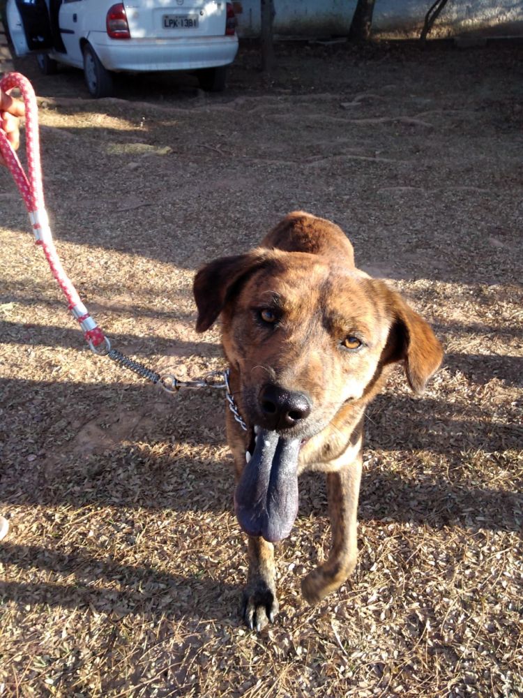 Esses são os dois irmãos: Tupã e Lupi (Tupã que na língua tupi -guarani significa trovão e Lupi que em latim tem o significado de lobo ). Não sabemos ao certo quanto tempo esses dois sobreviveram sozinhos. Não se tem certeza se chegaram perdidos de outro local ou se foram abandonados por antigos moradores do condomínio Solar da Serra. Tudo começou quando ficamos sabendo que havia um cachorro solto andando pelas ruas do condomínio e rasgando os lixos. Descobrimos que ele se abrigava em uma casa em construção. Passamos a levar comida e água até esse local e assim conhecemos esse lindo cachorro tigrado da língua roxa que batizamos de Tupã. Depois de alguns dias nos deparamos com outro cachorro junto com o Tupã, esse lobo da língua roxa que nos encantou com o seu jeito misterioso e que demos o nome de Lupi. Ficamos por vários meses alimentando e levando água para os dois ao mesmo tempo que procurávamos os donos. Nunca apareceu ninguém, mas alguns moradores da rua onde os dois estavam começaram a reclamar da presença deles. Chamaram até a zoonose para capturá-los mas não conseguiram nem chegar perto: esses dois conhecem cada esconderijo dentro desse vale onde se encontra o Solar da Serra e ninguém conseguia pegar eles. Foi aí que a Administração do condomínio pediu a nós que fizessemos o resgate e cederam um espaço para abrigar os dois e assim passamos a cuidar deles em um local seguro, sem ameaças daqueles que só enxergavam nessas vidas abandonadas um problema para ser resolvido. Hoje estão em um canil onde continuam sendo alimentados por nós e outra vizinha que se voluntariou para ajudar também com os passeios diários.Já estão vermifugados e com a primeira dose da vacina. Serão castrados e breve estarão disponíveis para adoção. São mestiços da raça chinesa Chow-Chow. São extremamente dóceis com pessoas. Inteligentes e disciplinados já passeiam de coleira e atendem a comandos. Não recomendado para viverem com outros cachorros machos. A adoção poderá ser conjunta ou não."